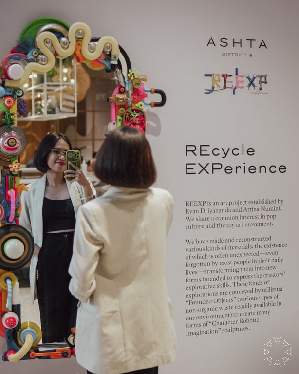 Karya seni REcycle EXPerience mengangkat tema “Karakter Imajinasi Robotik,” yang memadukan objek-objek yang ditemukan dengan sampah non-organik dan ditransformasikan menjadi bentuk-bentuk baru yang menakjubkan. Melalui karya ini, ASHTA District 8 berharap dapat menginspirasi masyarakat untuk melihat potensi dalam setiap benda yang dianggap tidak berguna, sekaligus menekankan pentingnya mengurangi limbah dalam kehidupan sehari-hari.